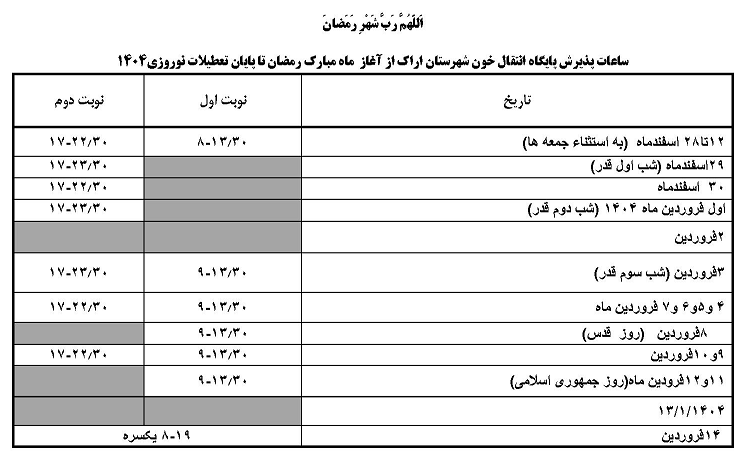 اعلام ساعات پذیرش اهدا کنندگان محترم در پایگاه انتقال خون شهرستان در ماه مبارک رمضان ۲۸ اسفند ۱۴۰۳ | ۱۳:۰۸ کد : ۵۰۲۶۹ اطلاعیه ارسال به دیگران نام شما ایمیل شما ایمیل دریافتکننده ارسال انصراف تعداد بازدید:۸۱۱۵ اعلام ساعات پذیرش اهدا کنندگان محترم در پایگاه انتقال خون شهرستان در ماه مبارک رمضان