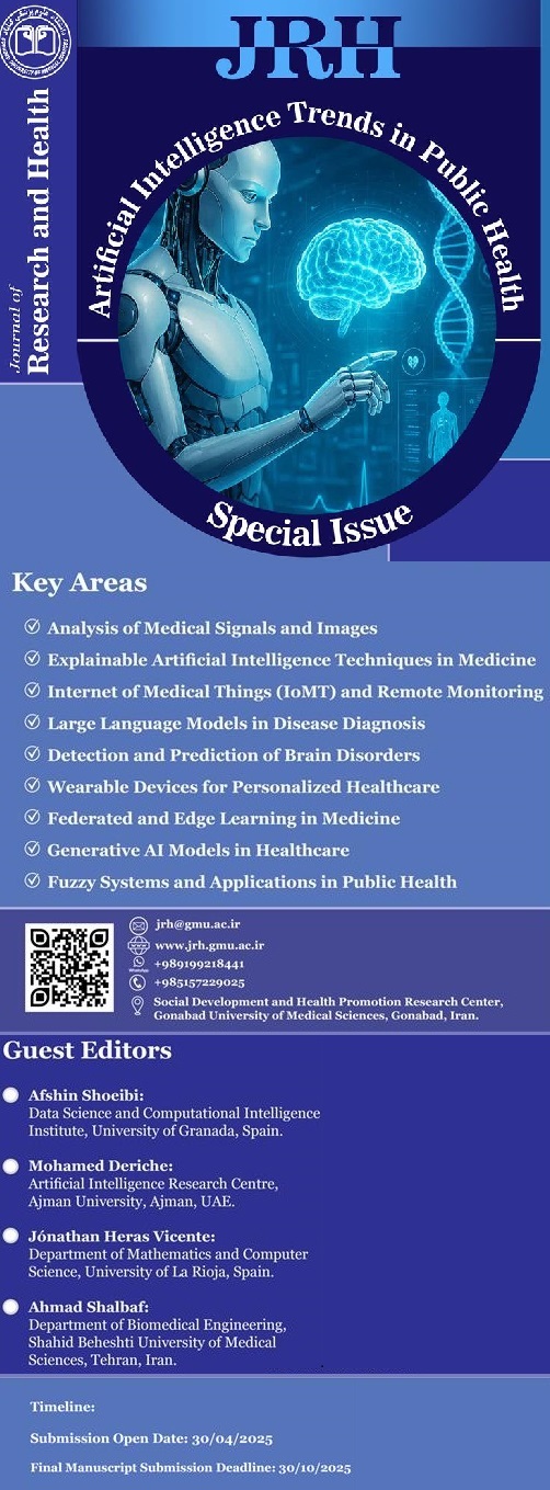 ژورنال Research and Health در نظر دارد به منظور گسترش مباحث علمی و پژوهشی در حوزه هوش مصنوعی، ویژه نامه ای تحت عنوان " Artificial Intelligence Trends in Public Health " منتشر نماید.