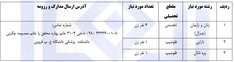 به اطلاع می رساند دانشگاه علوم پزشکی قزوین جهت تامین نیازهای آموزشی خود از بین فارغ التحصیلان در رشته های مشروحه ذیل به صورت هیات علمی متعهد خدمت دعوت به همکاری می نماید. متقاضیان واجد شرایط می توانند از تاریخ ۱۴۰۴٫۰۴٫۱۰ لغایت ۱۴۰۴٫۰۵٫۱۰ با تلفن مندرج در جدول زیر تماس حاصل نمایند.