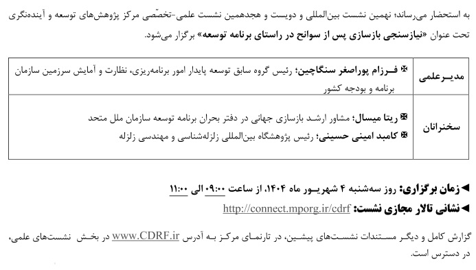 نشست علمی نیاز سنجی بازسازی سوانح در راستای برنامه توسعه ۰۳ شهریور ۱۴۰۴ | ۱۲:۳۷ کد : ۵۴۰۰۰ اطلاعیه ارسال به دیگران نام شما ایمیل شما ایمیل دریافتکننده ارسال انصراف تعداد بازدید:۲۴۵۹ نشست علمی نیاز سنجی بازسازی سوانح در راستای برنامه توسعه، توسط مرکز پژوهش های توسعه و آینده نگری برگزار می گردد.