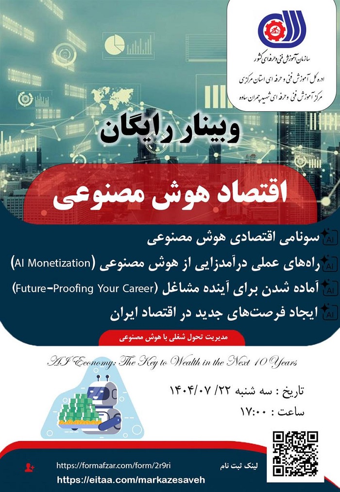 به اطلاع می رساند امروزه هوش مصنوعی (AI) نه صرفاً یک ابزار تکنولوژیک بلکه به عنوان یک سونامی اقتصادی در حال بازآفرینی مدل های کسب و کار و مشاغل در سطح جهانی به شمار می آید. در همین راستا مرکز آموزش فنی و حرفه ای شهید چمران ساوه نسبت به برگزاری وبینار آموزشی یک روزه تحت عنوان « اقتصاد هوش مصنوعی » با هدف تمرکز بر درآمدزایی عملی از هوش مصنوعی (Al Monetization، آماده سازی برای آینده مشاغل Future - Proofing Your Career) و شناسایی فرصت های جدید اقتصادی برای نیروی کار ماهر کشور را برنامه ریزی نموده است.
