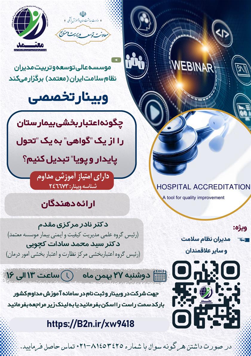 وبینار تخصصی "چگونه اعتباربخشی بیمارستان را از یک "گواهی" به یک "تحول پایدار و پویا" تبدیل کنیم؟ ۲۶ بهمن ۱۴۰۴ | ۱۲:۱۴ کد : ۵۸۰۱۱ اطلاعیه ارسال به دیگران نام شما ایمیل شما ایمیل دریافتکننده ارسال انصراف تعداد بازدید:۶۴۳ برگزاری وبینار تخصصی "چگونه اعتباربخشی بیمارستان را از یک " گواهی" به یک " تحول پایدار و پویا " تبدیل کنیم؟