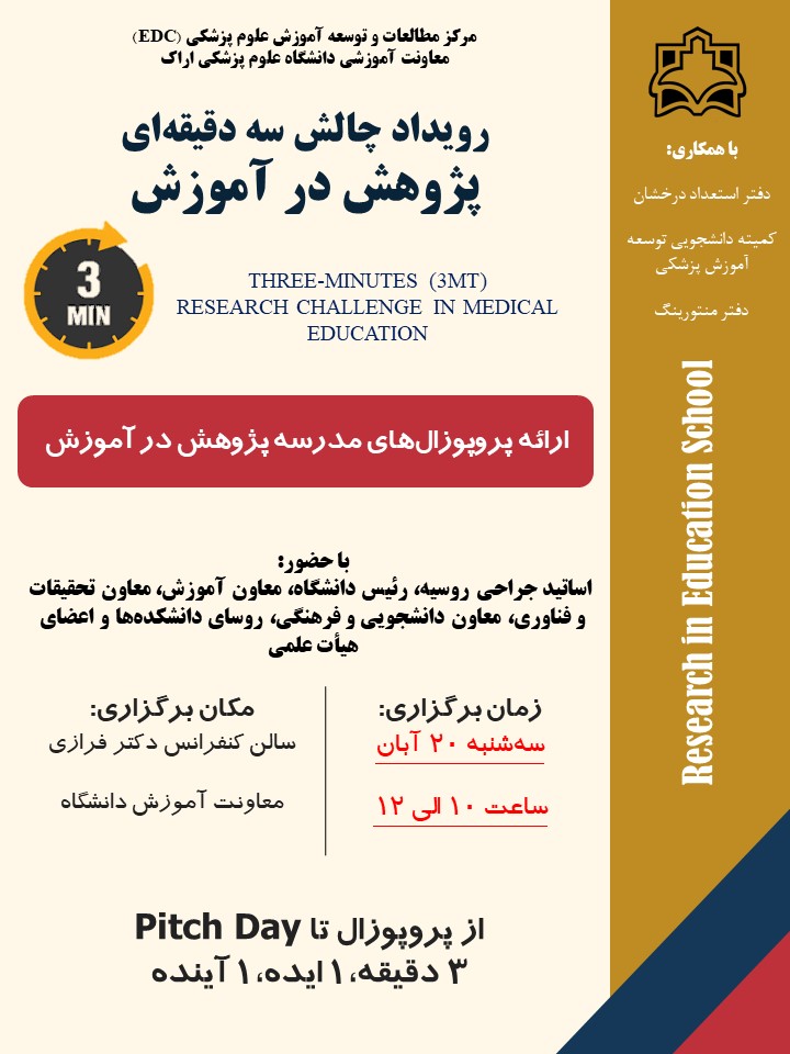 مرکز مطالعات و توسعه آموزش علوم پزشکی (EDC) معاونت آموزشی دانشگاه علوم پزشکی اراک با همکاری دفتر استعداد درخشان، کمیته دانشجویی توسعه آموزش پزشکی و دفتر منتورینگ برگزار میکند: